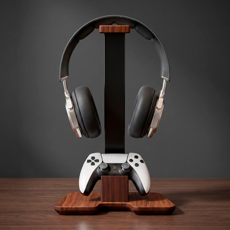 Um lar exclusivo para seu headset e controle. Design elegante que harmoniza e organiza seu espaço com maestria.